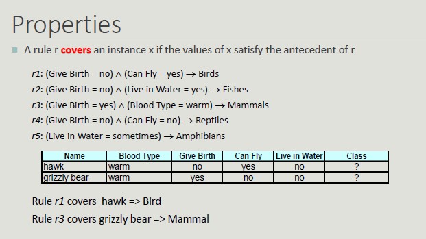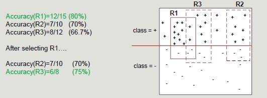 - Properly classified instances: to avoid generating the same rule again and again, avoid overestimating the accuracy of the next rule