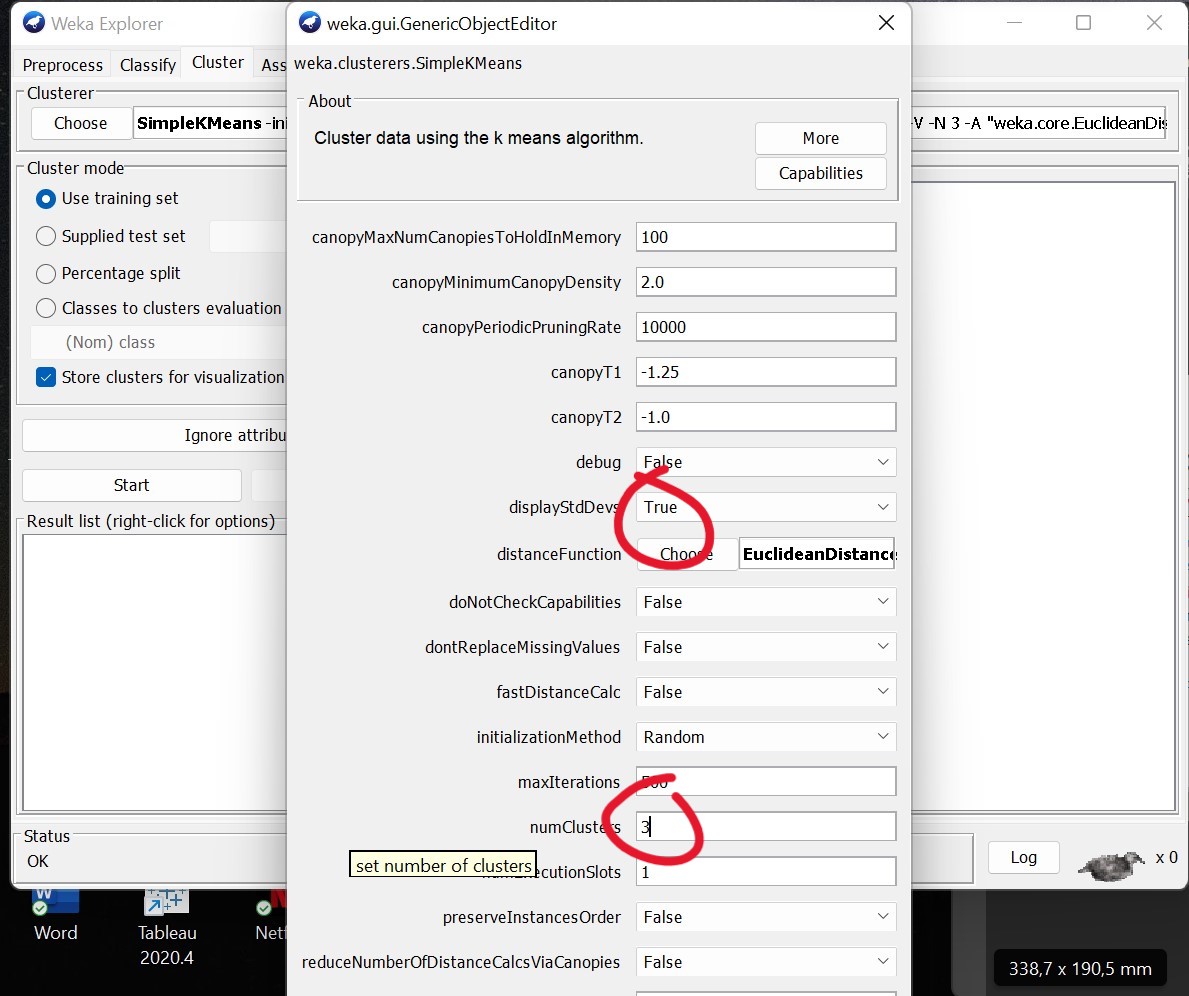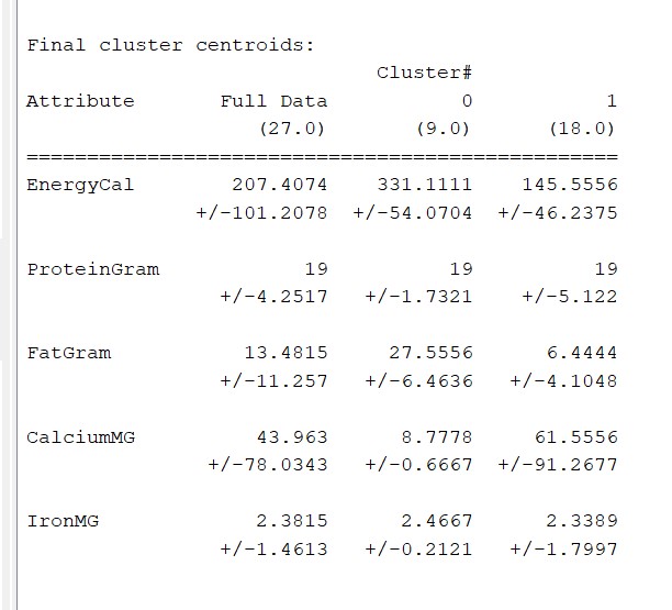 - DisplayStDev: shows the standard deviation of the distances of individual points from the cluster center. The measure is reported separately for each attribute.