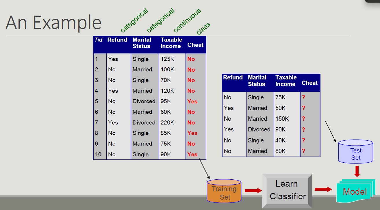 Given a record set, where each record is composed by a set of attributes (one of them represents the class of the record), find a model for the class attribute expressing the attribute value as a function of the remaining attributes.